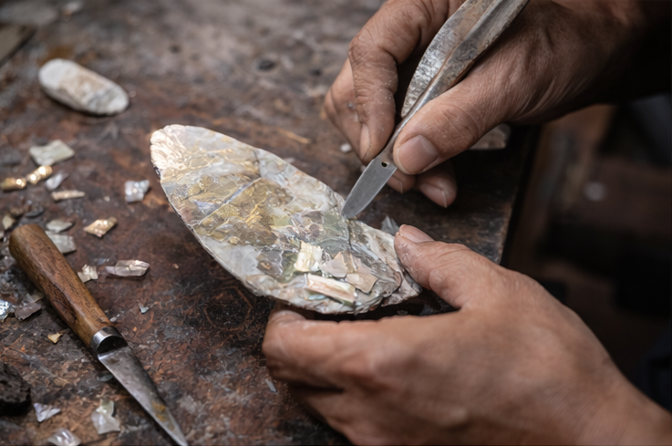 Each piece begins with raw shell, carefully selected for its luster and character. Artisans cut, shape, and polish every fragment by hand, honoring the natural variations that make no two pieces alike. The inlay process itself is meticulous: every element is individually placed, aligned, and set to create harmony between pattern, light, and form.