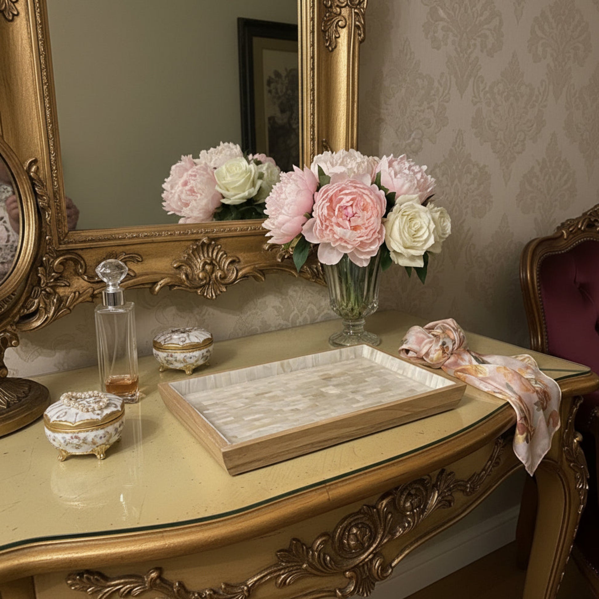 Hand-crafted from natural mother of pearl and framed in warm, finely grained wood, this piece captures the quiet brilliance of celestial light. Each iridescent tile is individually placed to form a soft, flowing mosaic that shimmers with every movement.