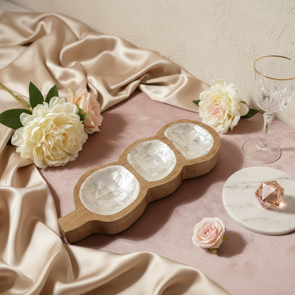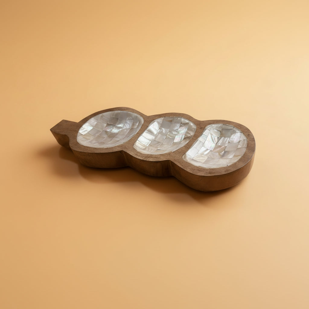 The Lumière Trine Valet is a sculptural statement piece crafted for the modern home. Carved from richly grained natural wood and inlaid with a mosaic of luminous mother-of-pearl, each of its three curved wells captures the light like liquid opal. The organic shape adds softness and artistry, while the iridescent tiles create a captivating interplay of shimmer and depth.